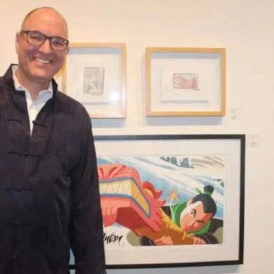 Podemos ver al artista Mike Butkus trabajando en una...